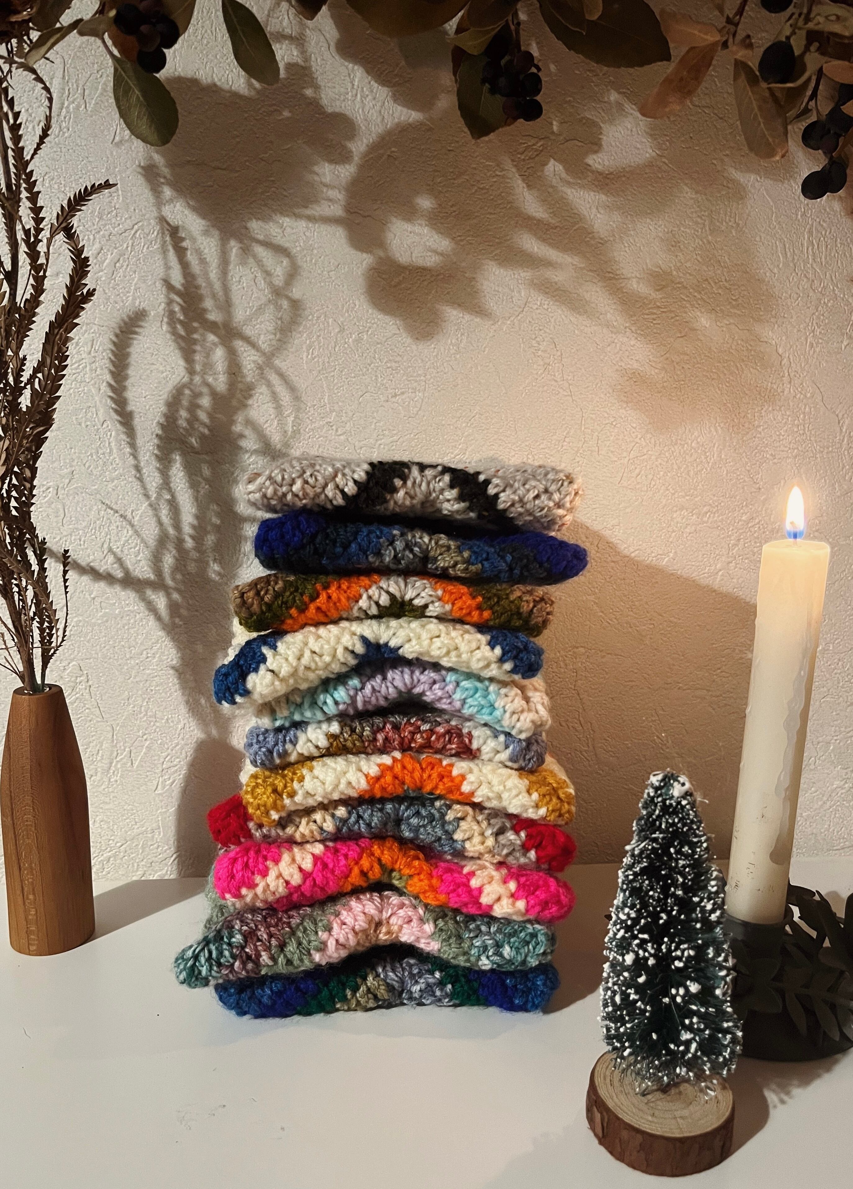 手編みならではの柔らかい風合いと、カラフルなデザインが目を引く一品です。