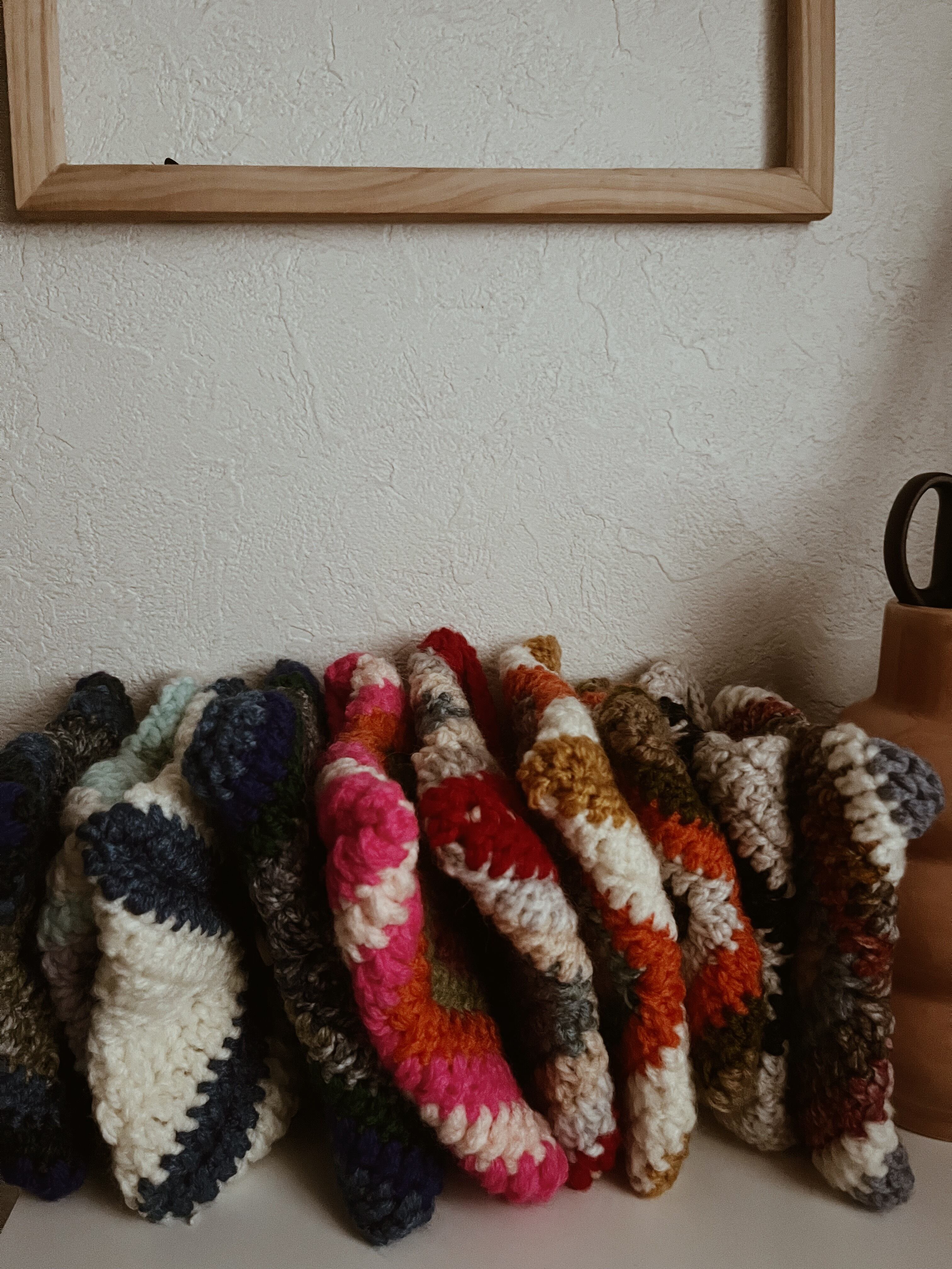手編みならではの柔らかい風合いと、カラフルなデザインが目を引く一品です。